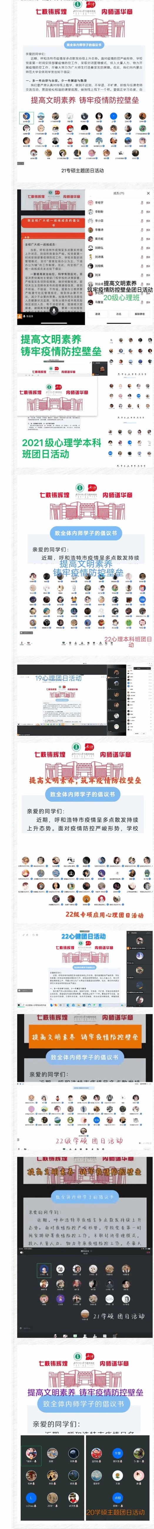 yl9193永利集团各个团支部10月5日晚至10月6日通过线上形式,组织召开主题为:提高文明素养,铸牢疫情防控壁垒的团日活动。活动中首先学习了10月5日学校召开的疫情防控及安全稳定工作会议的精神和要求。同时讲清楚了当下疫情形势的严峻复杂,校园安全稳定的重要性。二是学习了学校防疫政策,学生违纪行为的危害性,科学戴口罩等防护措施的必要性,严守纪律、严格按照学校安排做好核酸检测的重要性。三是讲情怀讲温度,引导学生厚植家国情怀、爱校情怀和责任担当。疫情当下学校的领导、学院的领导、辅导员是与学生同吃同住同甘苦的。引导学生从感情上建立同理心,多一份理解多一份以身作则。四是学习了学校发给全体学生的倡议书。