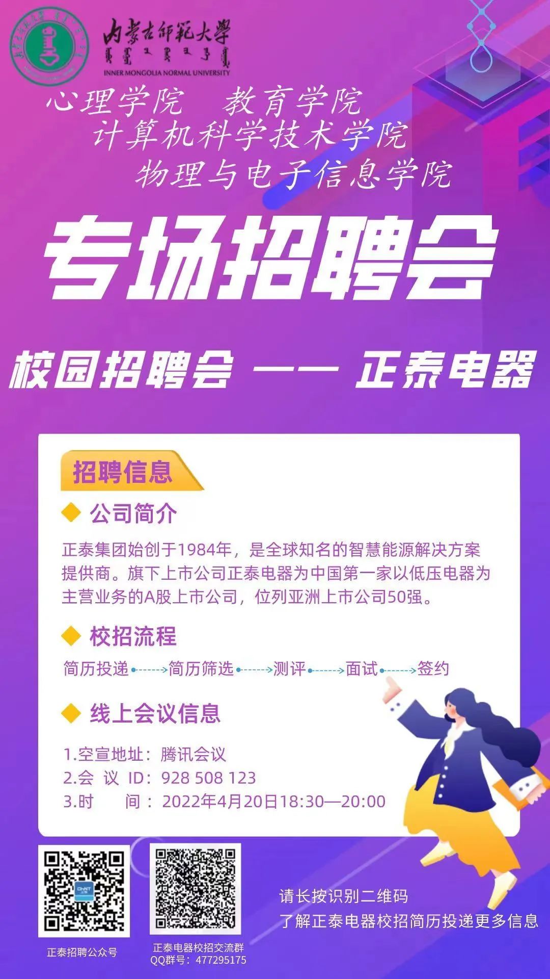 为深入贯彻党中央、国务院“稳就业”“保就业”决策部署,进一步做好毕业生就业工作,拓宽就业渠道,实现高质量就业, 4月20日,yl9193永利集团通过校友积极联系正泰电器,面向yl9193永利集团、教育学院、物理与电子信息学院、计算机科学技术学院等召开2022届毕业生线上专场招聘会。
