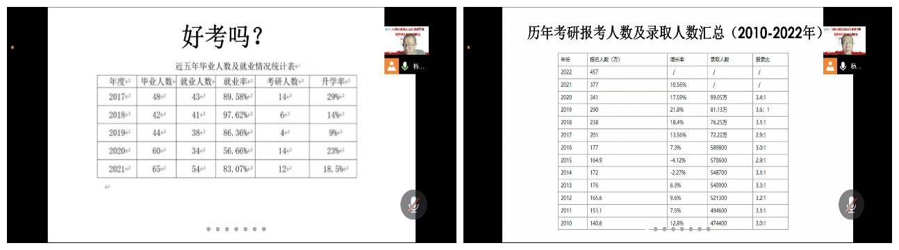 杨晓峰老师通过对近10年全国考研形势以及近五年我院学生考研状况的分析,结合自己的求学经历,要求同学们及早规划、及早动手,尽快根据自己的实际情况制定考研计划,确定目标院校和专业,鼓励同学们保持决心、恒心和平常心对待考研,要从战术上重视、战略上有准备,同学们内部要团结,多沟通交流,相互鼓励。