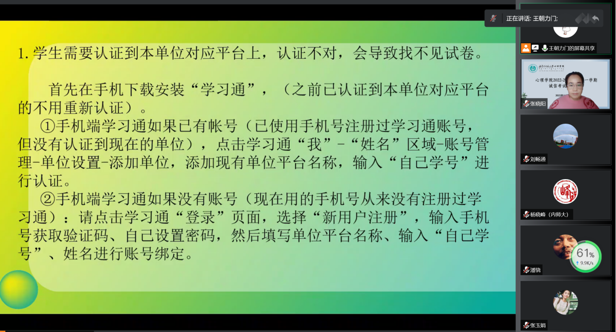 会上,杨晓峰进行了考前复习指导及考试重要事项提示,要求学生诚信考试,树立良好学风;王朝力门详细讲解线上考试流程、平台使用方法及突发特殊情况的应对处置等,确保学生们顺利进行考试。