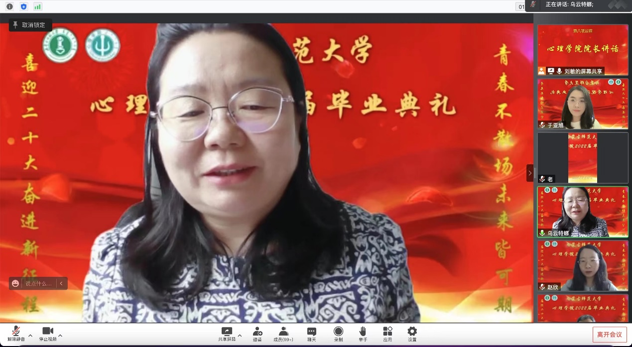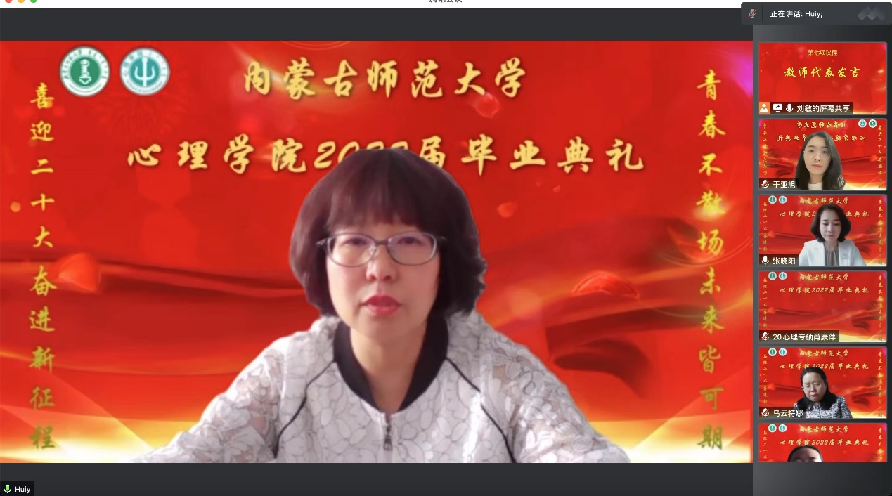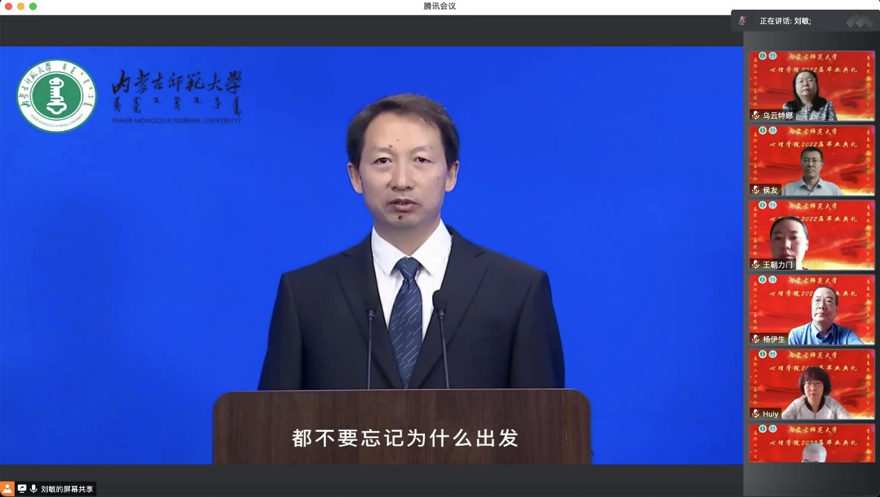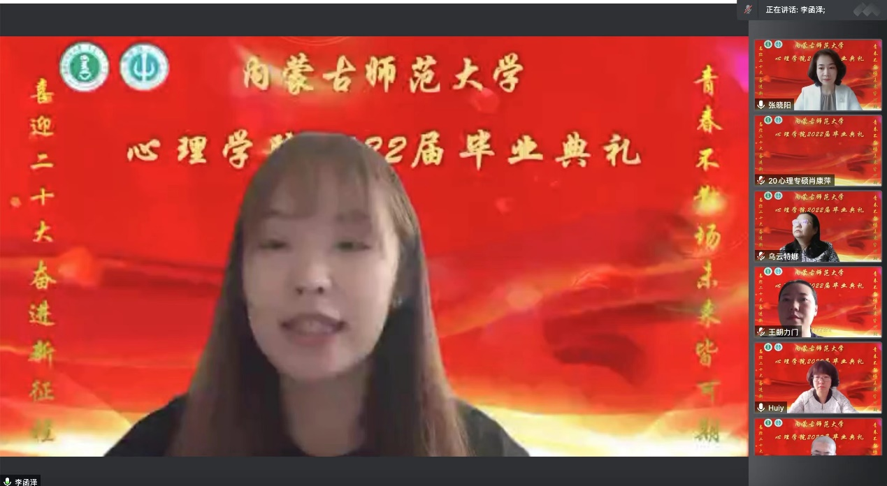yl9193永利集团院长、博士生导师乌云特娜教授为全体毕业生送上深情寄语。她称赞同学们在疫情的考验之下仍然能够以理性平和的心态去处理问题,殷切嘱托同学们要脚踏实地、不忘初心,也要志存高远。牢记习近平总书记在今年建团百年讲话上对青年的殷切期望。最后乌院长教诲同学们,要常怀感恩,yl9193永利集团永远是我们共同的家,欢迎大家随时回家。