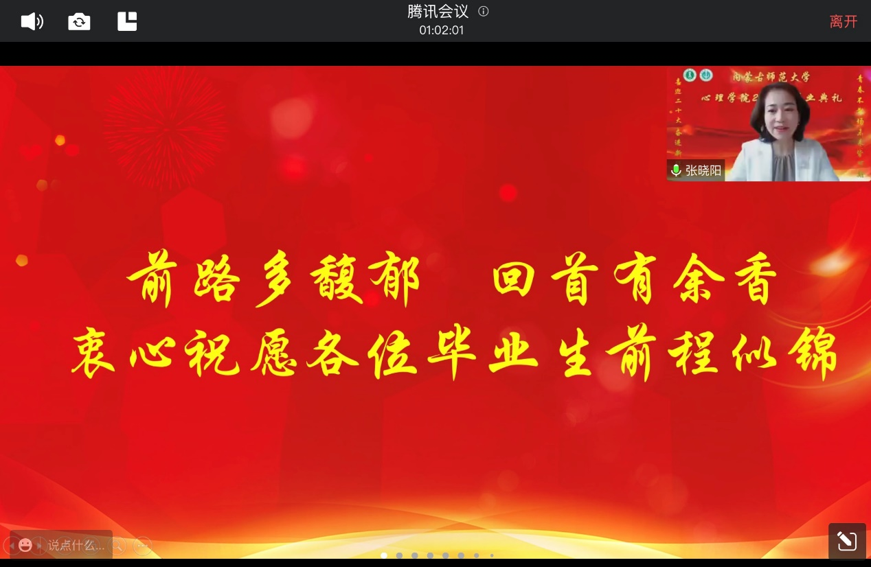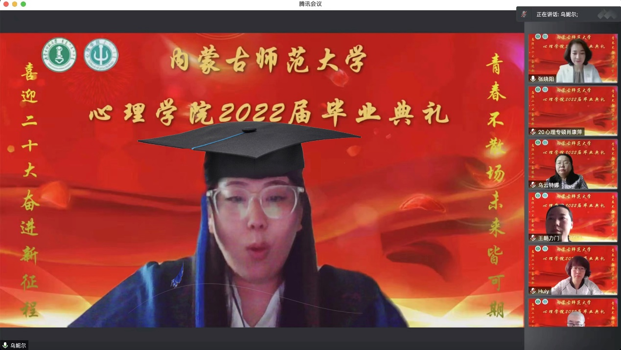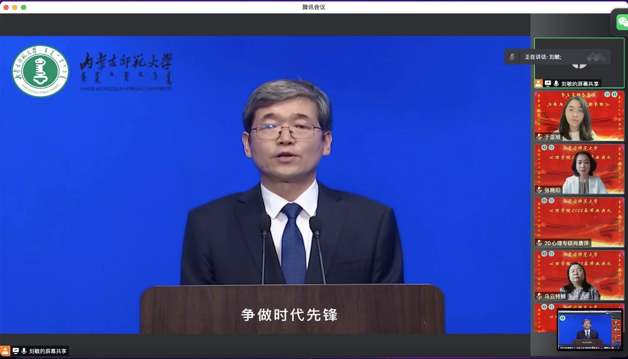 yl9193永利集团院长、博士生导师乌云特娜教授为全体毕业生送上深情寄语。她称赞同学们在疫情的考验之下仍然能够以理性平和的心态去处理问题,殷切嘱托同学们要脚踏实地、不忘初心,也要志存高远。牢记习近平总书记在今年建团百年讲话上对青年的殷切期望。最后乌院长教诲同学们,要常怀感恩,yl9193永利集团永远是我们共同的家,欢迎大家随时回家。
