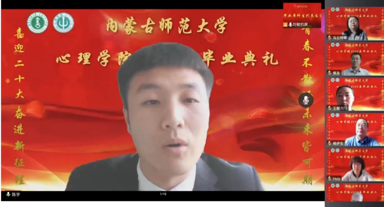 2018级心理学班本科生陈宇作为毕业生代表发言。和大家一起回忆了四年在学校经历的学生工作、志愿服务等美好时光,并表示作为一名心理学子,在即将开启的新征程中,将在未来的工作中刻苦奋进,不负时代,为建设祖国与家乡贡献自己的青春力量,彰显青年一代“请党放心,强国有我”的铮铮誓言。