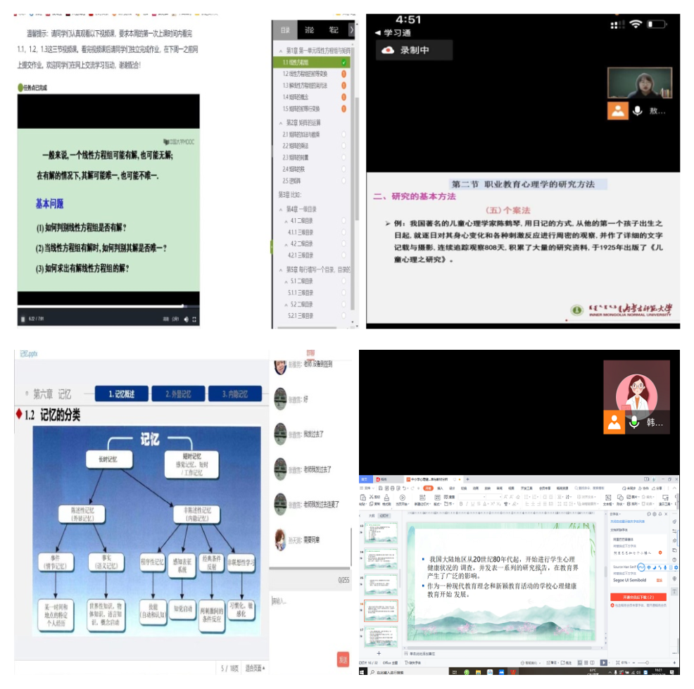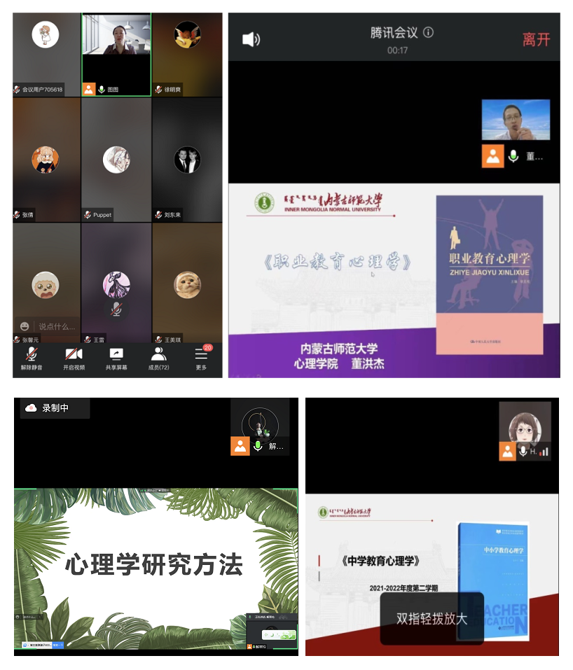 开学第一天,我院共有11门本科课程,3门研究生课程顺利开课,教师们充分利用“内师在线”教学平台,选取优质教学资源,采用视频直播等方式,辅助微信、腾讯会议、QQ群等进行课堂教学、辅导和在线答疑;学生们积极参与线上学习和讨论;学院领导和教学督导深入到每门课堂进行听课指导,保障教学质量;以良好的精神面貌给新学期开了个好头。