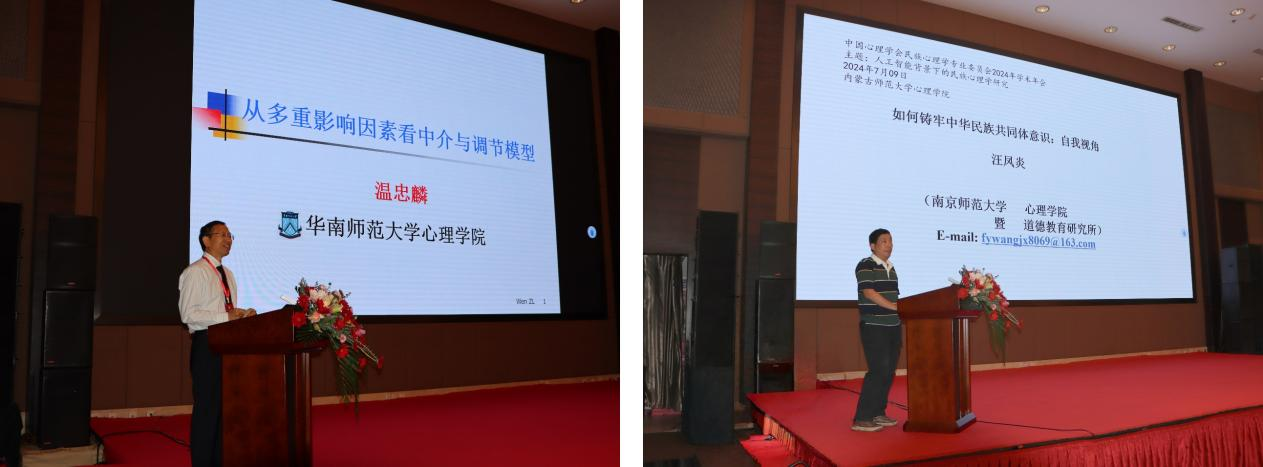 开幕式后,华南师范大学温忠麟教授、南京师范大学汪凤炎教授、上海交通大学李卫东教授、浙江大学周宵研究员和永利官网王欣瑜教授分别就《从多重影响因素看中介与调节模型》、《如何铸牢中华民族共同体意识:自我视角》、《AI 与脑机交互技术在抑郁中的探索研究》、《青少年创伤心理的变化特征及代际影响》和《深层文化结构视阈下的中国心理学本土化省思》等议题做了五场特邀报告,分享了民族心理学国内前沿科研成果和实践经验,为与会者奉献了一场高水平的饕餮盛宴。