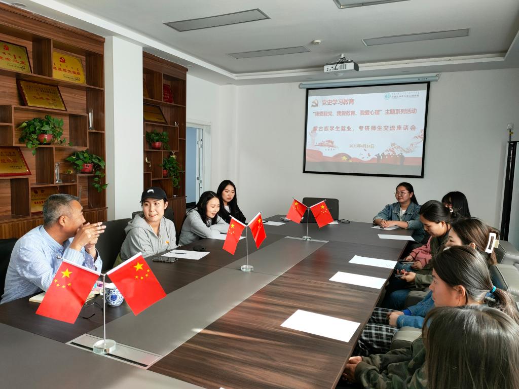 为扎实开展党史学习教育、推进“我为群众办实事”实践活动,贯彻落实党中央、国务院“稳就业”、“保就业”决策部署,积极推进我院毕业生高质量就业,促进教育高质量发展,4月14日下午,yl9193永利集团党总支在学院楼B213会议室开展“我爱我党、我爱教育、我爱心理”党史学习教育主题实践活动——召开蒙古族学生就业、考研师生交流座谈会。党总支书记七十三、副书记张晓阳、学就办主任张金钟与2017级、2018级心理学专业学生进行交流座谈。